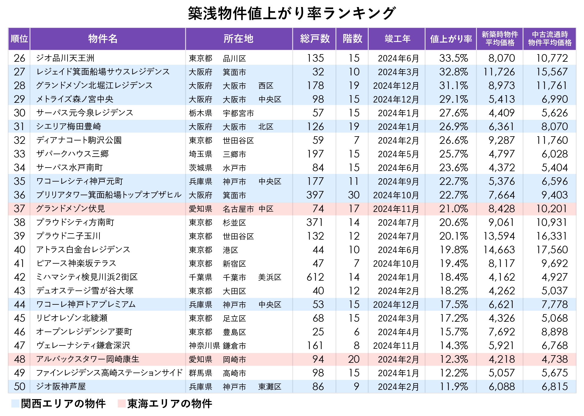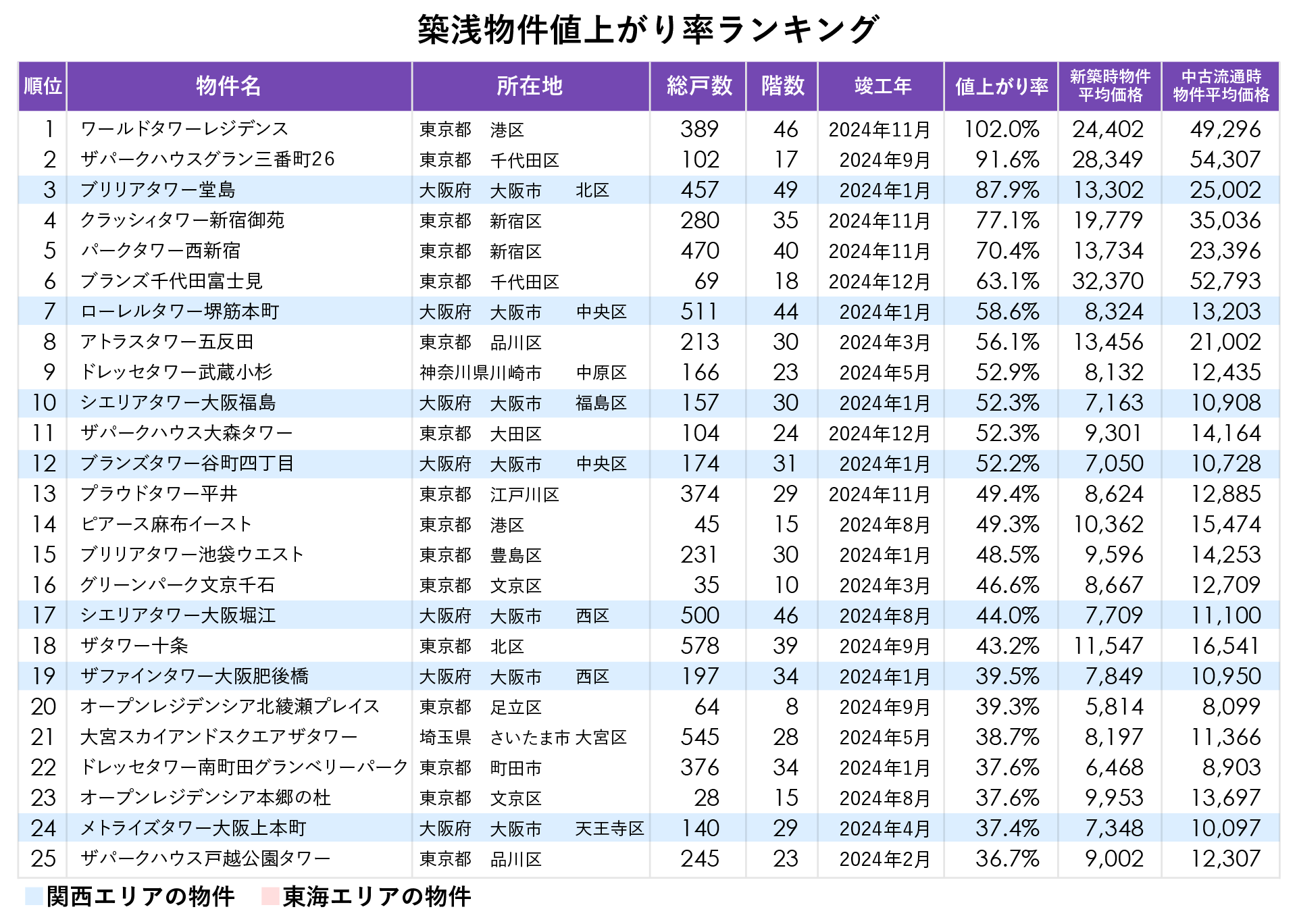 今回は東名阪エリアで2024年に竣工した新築分譲マンションのうち、2025年に中古流通した際の値上がり率が高いマンションをランキングにしました。